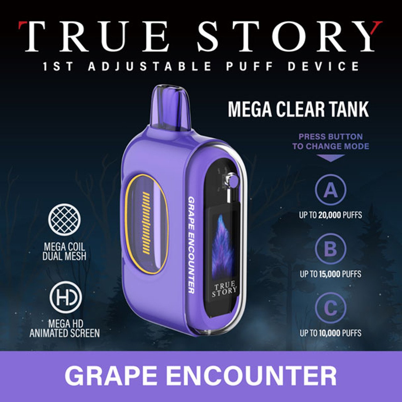 Check out the True Story 20K Disposable, featuring a 20mL Mega Clear Tank, integrated battery, Mega Dual Mesh Coils, and adjustable firing modes to tailor the output. Engineered with the most innovative, convenient, and performance-oriented features, the True Story 20000 Disposable unlocks a plethora of vaping options, loaded with a Mode A, Mode B, and Mode C firing, each mode outputting 20K, 15K, and 10K puffs, respectively. Boasting an HD Mega Screen, the True Story Disposable displays the remaining battery and e-liquid levels, ensuring that you are never caught unaware. Outfitted with three power modes, the True Story 20K can achieve anywhere from 10K-20K puffs, depending on the selected mode and power levels.